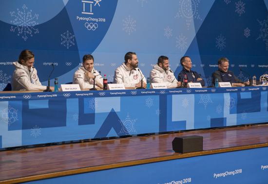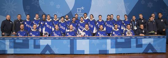 After practice, the team returned to the athlete’s village for lunch and then jumped on a bus to head up to the mountains and the main press center for a press conference and media availability. All 25 players and the entire coaching staff participated. The formal press conference included head coach Tony Granato and players Brian Gionta, Ryan Zapolski, Marc Arcobello and Matt Gilroy. Following the 30-minute press conference, all players and coaches were spread around the room for a 40-minute media availability session. Troy Terry turned out to be a favorite of the volunteers and he took many pictures with various members of the staff following the formal proceedings.