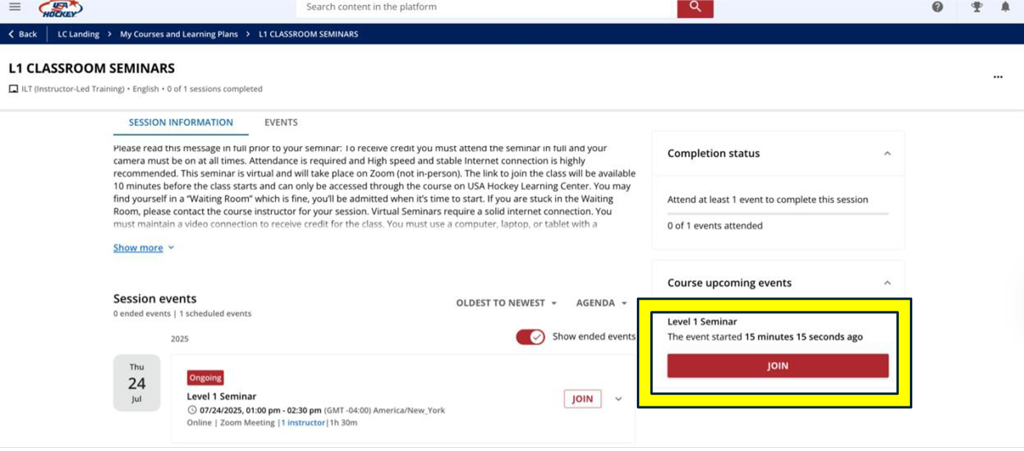 In this example, a Level 1 official must complete his Classroom Seminar, Level 1 Modules, and the Level 1 Playing Rules Exercise.