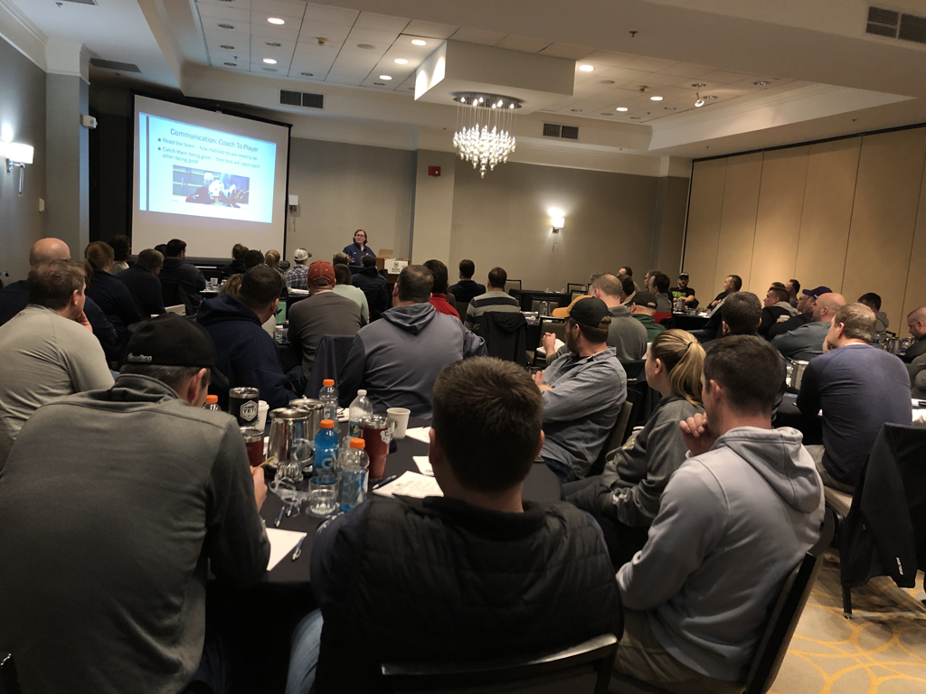 Holy Cross Head Coach, Katie Lachapelle, speaks to coaches about communication and creating good teammates.