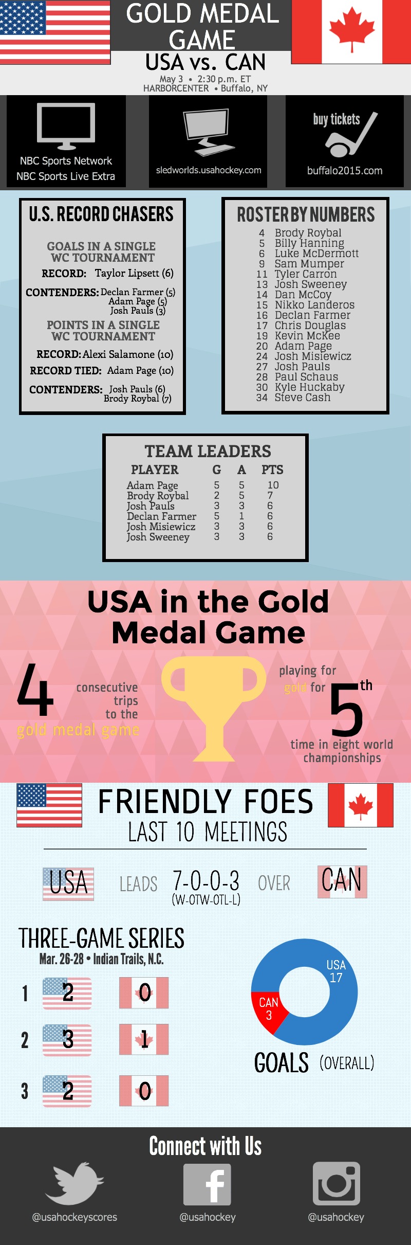 Today’s game will take place at 2:30 p.m. ET at the HARBORCENTER in Buffalo, New York. The game will be televised live on NBC Sports Network and streamed live on NBC Sports Live Extra. Follow the updates on Twitter @USAHockeyScores and join the conversation by using the hashtags #Buffalo2015 and #SledWorlds.