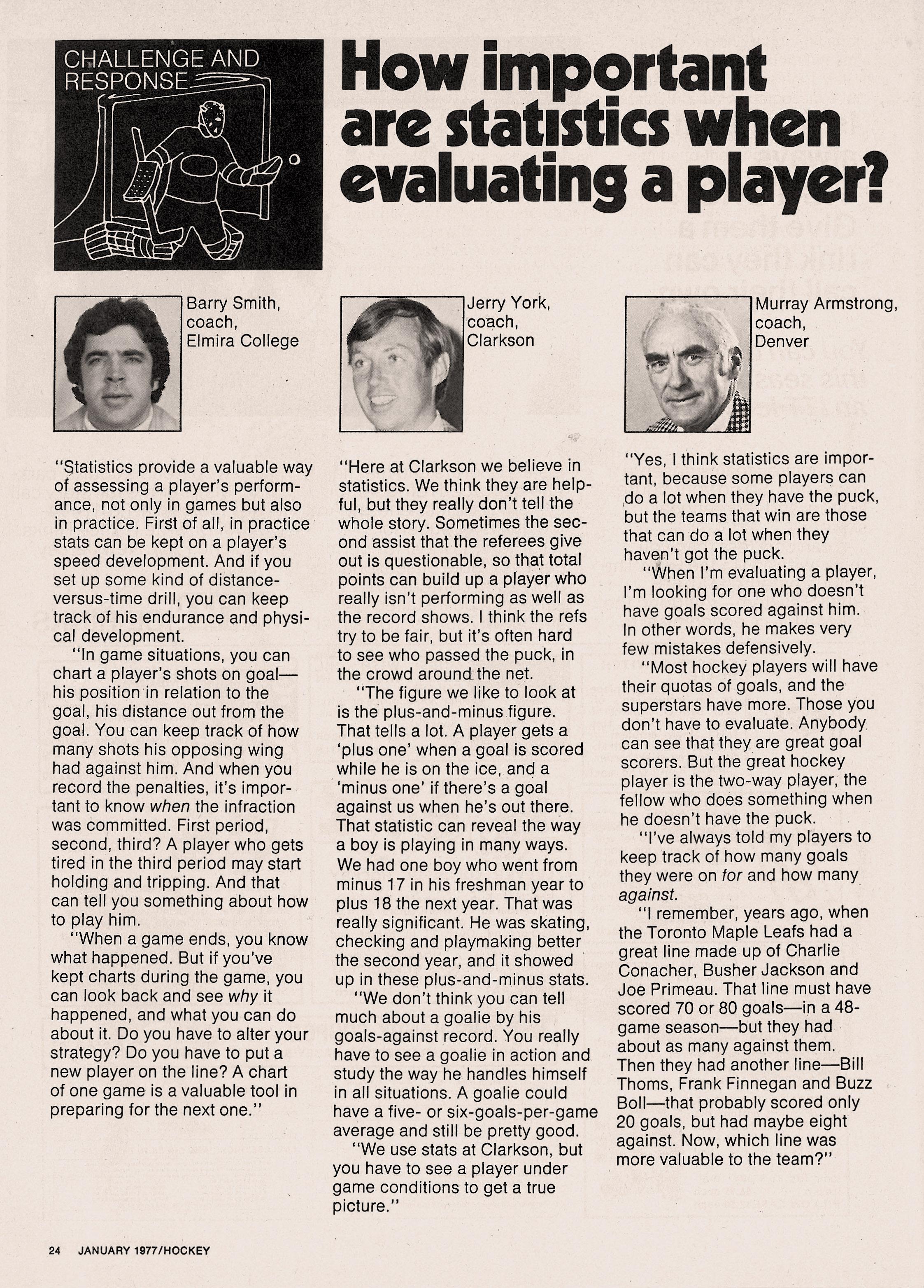He’s been a believer since the mid-1970s, when he led Elmira College to consecutive NCAA Division II national tournaments as a twenty-something head coach. That’s when Hockey magazine queried Smith, Jerry York and Murray Armstrong about using statistical analysis in player evaluation. All three cited situations in which they favored it, but only Smith talked about practice (see excerpt at bottom).