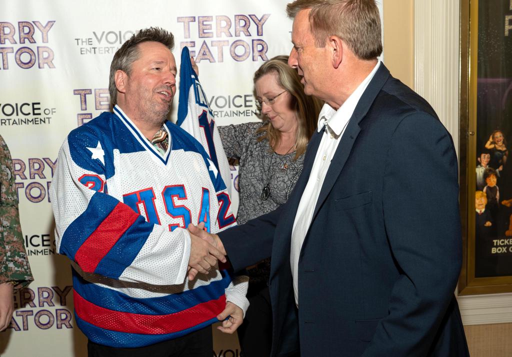 USA Hockey president Jim Smith presents Terry Fator with a custom USA Hockey jersey to kick off the festivities at the 2018 Warrior Classic.